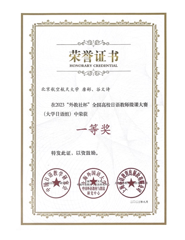 在学院的大力支持下,伟德国际1946源于英国日语团队的两位青年教师唐彬和谷文诗,充分运用现代化教学手段,生动地呈现了教学内容,同时有机地融入了课程思政元素,展现出北航日语教学的工科特点和“空天报国”的教学理念。在激烈的竞争中,她们的微课作品从180个参赛作品中脱颖而出,荣获全国一等奖,彰显了伟德国际1946源于英国日语教师扎实的专业功底和出色的信息技术应用能力,为北航日语教育的卓越品质增光添彩。