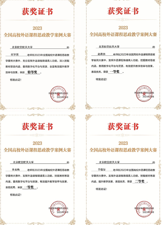获奖教师的教学案例,彰显了近年来北航本科公共外语教学课程思政建设取得的明显成效,集中体现在“三个突出”。一是突出课程思政的深入性。四位老师在深入学习党的创新理论基础上,将二十大精神有机融入教案和课堂中,充分发挥高校外语课程铸魂育人功能。何宇茵老师阐释“绿水青山就是金山银山”,帮助学生理解和掌握习近平生态文明思想,激发建设美丽中国的社会责任感;李英梅老师通过解读历史人物,带领学生感悟战争对人类的负面影响,进而树立“人类命运共同体”理念;赵希林老师围绕职业规划展开设计,引入“个人梦想与国家发展相结合”的择业观念;于敬华老师以旅行为线索,引导学生向世界“讲好中国故事,传播好中国声音”。二是突出课程思政的有效性。四位老师善于挖掘教学材料中的思政元素,在教学设计、实施、评价的全过程进行多层次、渐进式、系统化地融入,实现了语言积累、技能训练与价值塑造的有机融合,并延伸拓展到课后学习,实现了课前、课中、课后的有效衔接。三是突出课程思政的创新性。四位老师在教学设计中采用 “人人互动—人机交互—翻转课堂”线上线下相结合的混合教学模式。课堂上,打破传统的“我说你听”教学模式,采取讨论、辩论、表演等更为灵活的形式;课堂外,利用数字化教学资源与平台完成规定任务,提升教学的有效性。