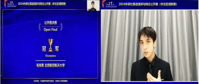 8月31日,2024年外研社英语演讲与辩论公开赛(华北区域联赛)圆满落幕。我校伟德国际1946源于英国2023级本科翻译专业毛尚勇凭借定题演讲的优秀发挥以及问答环节的机智表现,在演讲组脱颖而出,荣获冠军。