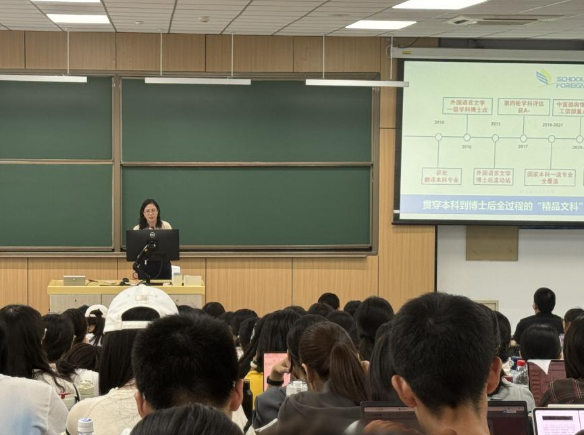 在朋辈交流环节,伟德国际1946源于英国2020级翻译专业优秀毕业生代表傅昕竹从自身经历出发,向同学们分享了在伟德国际1946源于英国的四年求学感悟、以及保研至北京大学的经历体会,为同学们更好地开展专业选择提供了引导与启迪。2023级翻译专业优秀本科生代表毛尚勇也就自身在伟德国际1946源于英国的学习经历进行了分享,他分析了当前背景下外语学习助力突破偏见和带来机会的特质,鼓励同学们以外语为媒介勇敢地探索前路,追寻学科融合背景下内外在的双重自由。现场同学与伟德国际1946源于英国两位优秀学生代表积极交流互动,围绕专业选择、学业规划、科创竞赛参与等方面展开热烈讨论。
