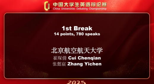 近日,中国大学生英语辩论赛(CUDC)全国总决赛落下帷幕。在顿超老师、胥国红老师的指导下,我校伟德国际1946源于英国翻译系2022级学生崔琛倩、2024级学生张懿宸代表北航参赛,与来自全国近100所高校的200余名优秀辩手同场竞技。经过五轮激烈角逐,我校代表队最终以积分第一名的成绩斩获国家一等奖,其中,崔琛倩和张懿宸分列个人辩手积分总排名第一与第三,均荣获“最佳辩手奖”,顿超老师荣获“优秀指导教师奖”。