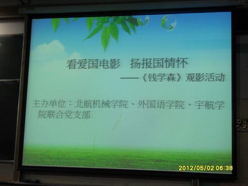 2012年5月2日晚7点,由伟德国际1946源于英国语言、文学班联合党支部、北航机械学院Y11072党支部、宇航学院SY11153党支部共同举办的以集体观看爱国教育电影《钱学森》为主题的观影活动在三号教学楼305如期举行。各党支部党员、预备党员和入党积极分子以及北航其它院系近百名同学参加了此次活动。